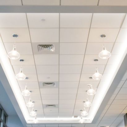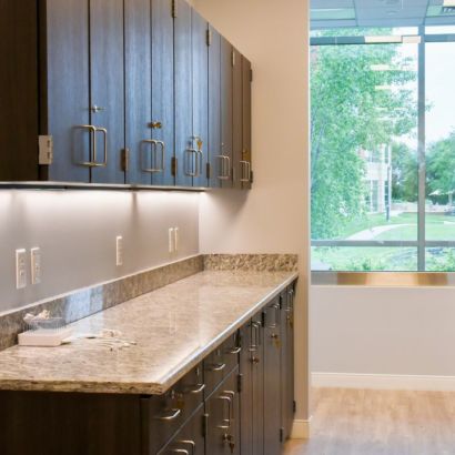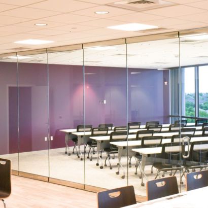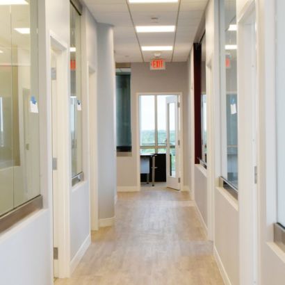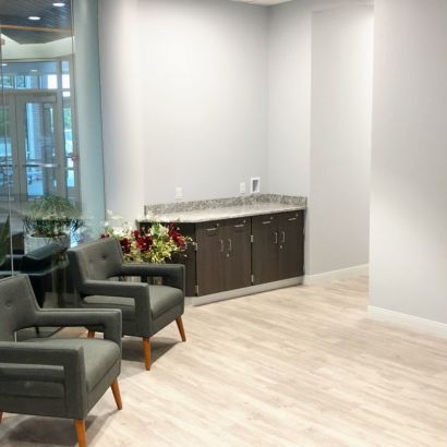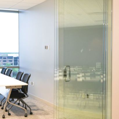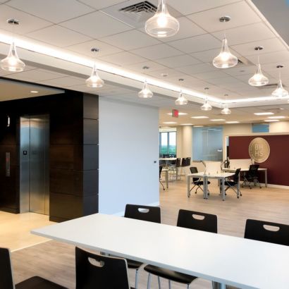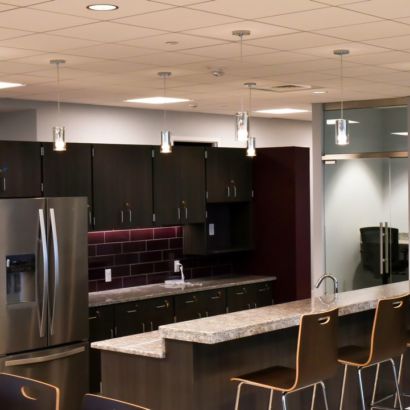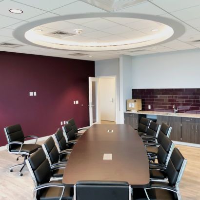 Snodgrass & Sons Construction Company finished the shelled space on three separate floors for Berkshire Hathaway Pen Fed Realty and Security 1st Title Company at the existing Hinkle Law Building at The Waterfront. The spaces renovated are on the 1st, 6th and 7th floors and consist of newly built Offices, Conference Rooms, Kitchens and Reception Areas. The renovation consists of high-end modern finishes catering to today’s real-estate business culture including level 5 drywall finishes, glass curtain-wall office fronts, granite counters, crown molding and high-end LED light fixtures. The 6th floor boasts a 28’ full glass operable wall that opens up a large meeting room to a kitchen and allows for large gatherings and events. Snodgrass meticulously coordinated and planned the layout of this operable wall to miss the existing post-tensioned cabling in the floor slab. At the southwest corner of the 6th floor is a “masters-of-the-industry” conference room overlooking The Waterfront and Wichita skyline with an illuminated rotunda ceiling cloud. Access controls were incorporated into the project to allow for secure and easy access for agents.